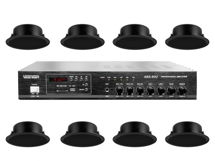 Zestaw przeznaczony jest do nagłośnienia powierzchni nie przekraczającej 150 m². W skład zestawu wchodzi: 8 głośników sufitowych MONACOR EDL-11TW, oraz wzmacniacz VOICE KRAFT ABS-80U