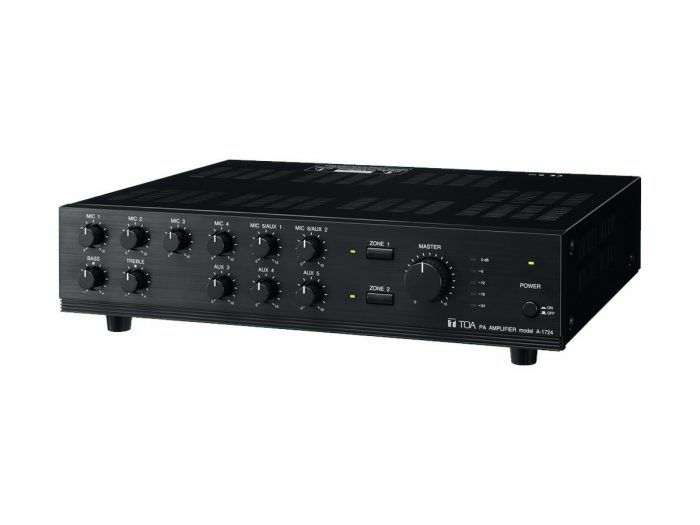 TOA A-1712 to rackowy wzmacniacz miksujący o mocy 120W wyposażony w 6 wejść mikrofonowych oraz 5 wejść AUX (jednocześnie wykorzystane może być łącznie 9 wejść).