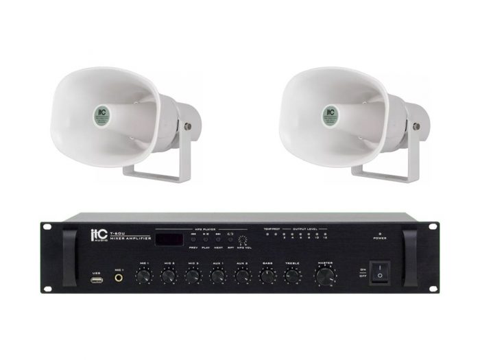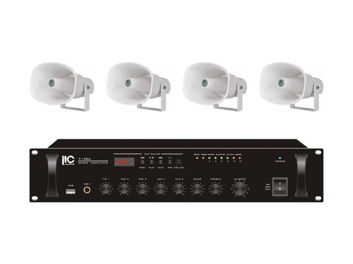Zestaw przeznaczony jest do nagłośnienia powierzchni nie przekraczającej 200 m². W skład zestawu wchodzi: 12 głośników naściennych ITC T-612 oraz wzmacniacz jednostrefowy ITC T-120.