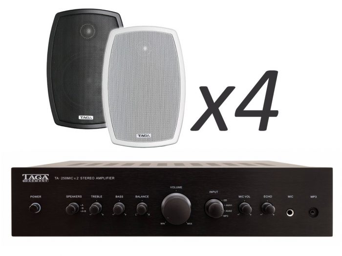Zestaw przeznaczony jest do nagłośnienia powierzchni nie przekraczającej 60 m². W skład zestawu wchodzą: 4 głośniki naścienne TAGA Harmony TOS-515, oraz wzmacniacz TA-250MIC