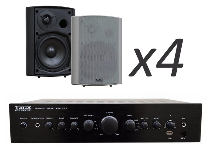Zestaw przeznaczony jest do nagłośnienia powierzchni nie przekraczającej 60 m². W skład zestawu wchodzą: 4 głośniki naścienne TAGA Harmony TOS-415 V.3, oraz wzmacniacz TA-400MIC