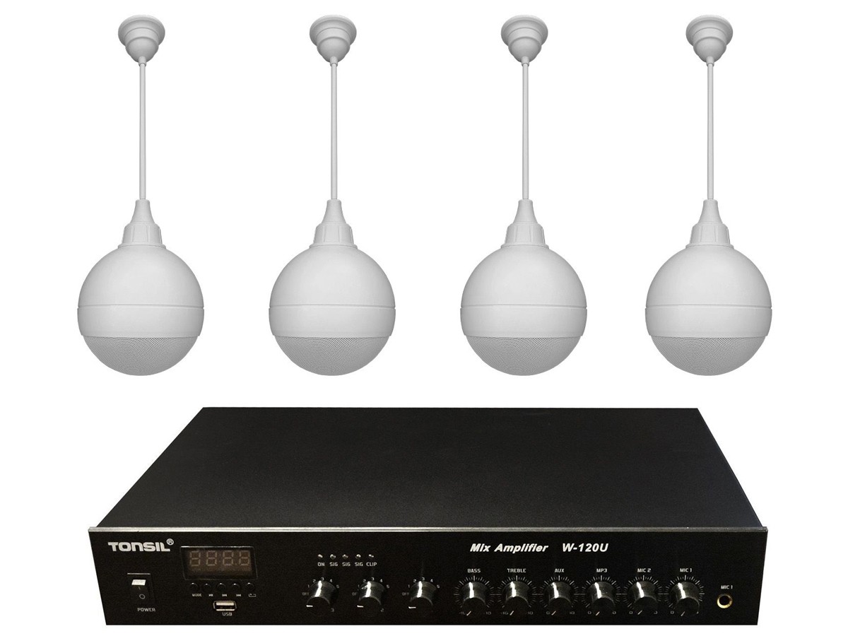 Zestaw nagłaśniający składający się z 3 strefowego wzmacniacza miksującego W-120U wyposażonego w odtwarzacz MP3 USB, dzięki któremu można odtwarzać muzykę z pendrive’a oraz 4 głośników sufitowych ZGSU 25 W. Dostępny wariant biały lub czarny.