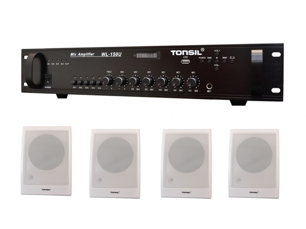 Zestaw nagłaśniający składający się z 5-cio strefowego wzmacniacza miksującego WL-180U wyposażonego w odtwarzacz MP3 USB, dzięki któremu można odtwarzać muzykę z pendrive’a oraz 4 głośników naściennych ZGR 10/120. Zestaw przeznaczony do nagłośnienia: sklepów, restauracji, barów, przychodni lekarskich itp.