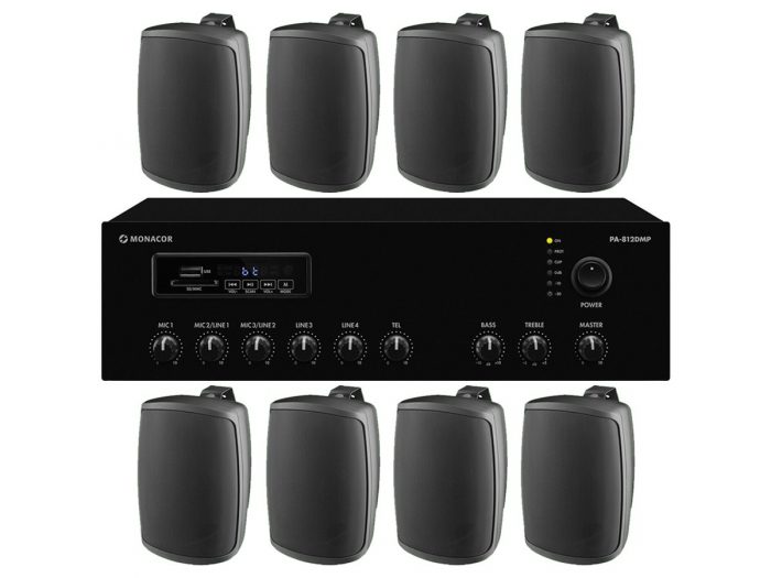 8x MONACOR WALL-04T + PA-812DMP – nagłośnienie naścienne do 150m2